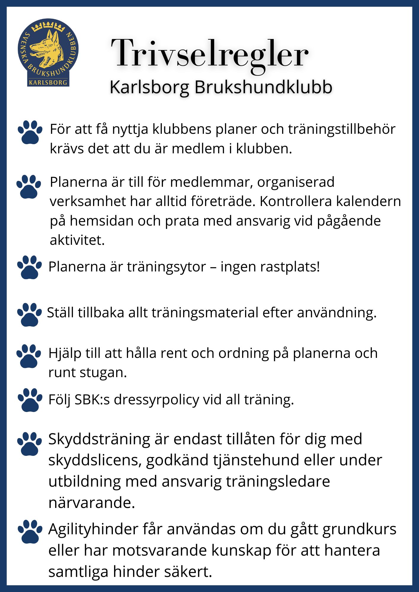 För att få nyttja klubbens agilityhinder ska man ha gått en grundkurs i agility eller ha kunskaper jämförbara med en grundkurs / ha god kunskap om alla hinder (för att hunden inte ska bli rädd eller skada sig).